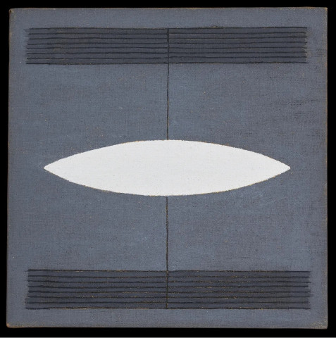 - Au deuxième étage, les matières solides ou liquides, fibre, eau, terre, cire, bois, huile, largement représentées dans les oeuvres des années 60 à 70, sont transformées en formes géométriques et sérielles que l’on retrouve dans la nature. Ainsi Michelle Stuart (avec Seyreville Stretta Quartet) nous montre 4 panneaux rectangulaires juxtaposés, terre sur papier chiffon doublé de mousseline, dans des tons orangés dégradés, explorant les « tensions » entre les formes conceptuelles et les substances organiques. Ici, avec le Land Art qui fit les beaux jours de la Fiac, les artistes interviennent dans le paysage naturel en le façonnant géométriquement ou en y plaçant des séries d’objets. Au même étage dans une autre salle sont exposées les peintures monochromes héritées du célèbre Carré noir sur fond blanc du peintre constructiviste Kasimir Malévitch.