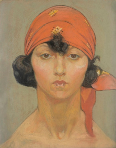 Exposition du 11 octobre jusqu'en 11 janvier 2026 organisée avec des prêts exceptionnels des Beaux-Arts de Paris, de la Villa Médicis à Rome et en relation avec la famille de l’artiste. Dans le cadre de Fiesta, 7e édition de lille3000. ©Autoportrait au foulard rouge, 1926. Pastel sur papier gris, collection particulière.