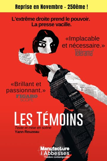 La pièce se situe dans la continuité de Chute d’une nation, constat impitoyable sur l’état de notre démocratie, qui se terminait par l’élection à la Présidence de la République d’un candidat d’extrême droite, Thomas Mérindien. Mais nul besoin d’avoir vu Chute d’une nation pour comprendre et apprécier Les témoins.