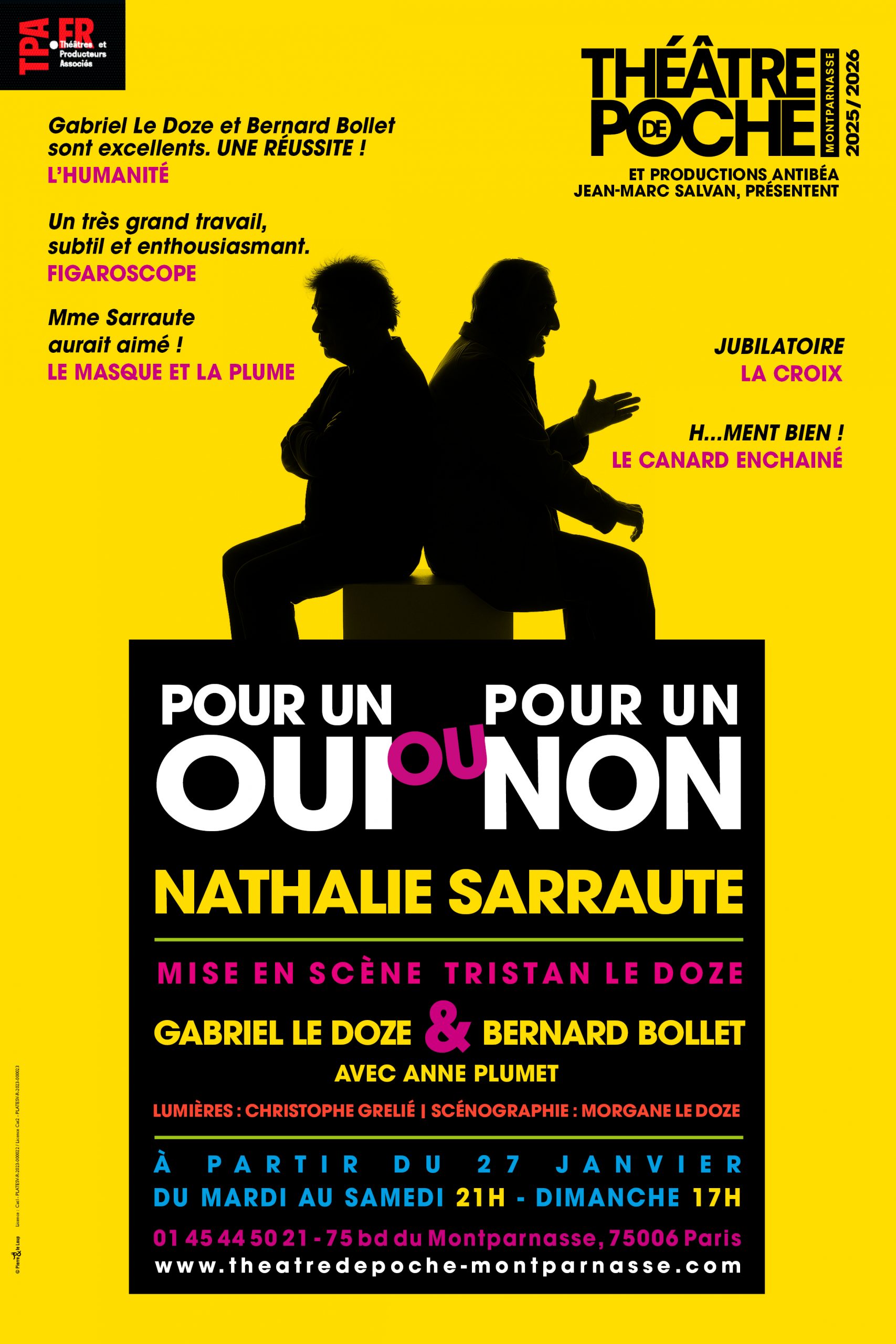 Dans une absence totale de décor (la pièce a été écrite au départ pour la radio), Gabriel Le Doze et Bernard Bollet avivent toutes les moirures de ce texte où le verbe et ses détours sont le vrai sujet. Comédiens très actifs dans le doublage, ils ont tous deux des voix superbes, magnifiquement domptées.